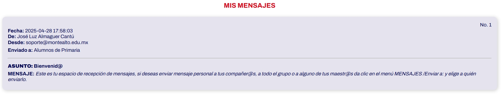 Puedes ver la fecha de envío con horas, minutos y segundos, quién te lo envía, desde dónde te lo está enviando (su matrícula, ID o correo) a quién se envió (si es personal se muestra tu nombre completo), si se envió a todo el grupo, al grado o al nivel. El asunto y el contenido del mensaje.