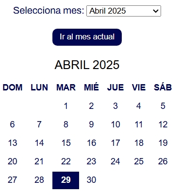 Muestra el calendario en el mes actual y al seleccionar un día, muestra su contenido. Si eliges otro mes puedes regresar en Ir al mes actual.